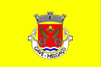 The arms are Gules two rye ears Or crossed per saltire flanking a fleur de lis Or offset to the chief and flanked by two watermill's wheels Argent and on a base wavy Argent a fess wavy Azure. Mural crown Argent with three visible towers (village rank) and white scroll reading in black upper case letters "GAVE - MELGAÇO".