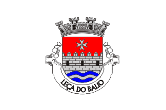 Shield Gules a castle and embattled wall Argent, masoned and slit Sable issuant from base wavy of Azure and Argent, in chief a Maltese cross Argent. Mural crown Argent with four visible towers (town rank) and white scroll reading "LEÇA DO BALIO" in black upper case letters.