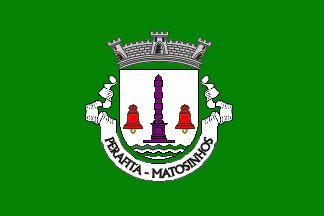 Shield Argent with base wavy of Vert and Argent, an obelisk Purpure flanked by two bells Gules with bobbins Or. Mural crown Argent with three visible towers (village rank) and white scroll with inscription in black capitals "PERAFITA - MATOSINHOS".