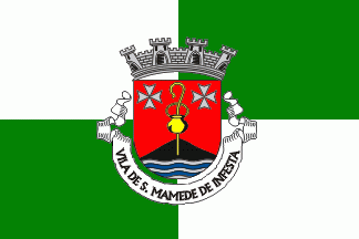 It was a typical Portuguese communal flag, with the coat of arms centred on a field quartered of white and green. The coat of arms was the same as current one but having mural crown Argent with four visible towers (town rank) and white scroll with inscription in black capitals "VILA DE S. MAMEDE DE INFESTA"