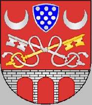 The crossed keys are an attribute of St. Peter, name giver and local patron saint. Inescutcheon and crescents are taken from the municipal arms.