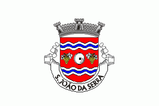Shield Gules, a millstone Argent, flanked by two grapevines Or leafed Argent, all between two bars wavy Argent, both charged with a barrulet wavy Azure. Mural crown Argent with three visible towers (village rank) and white scroll with inscription in black capitals "S. JOÃO DA SERRA".