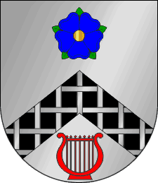 The arms are Argent a chevron Sable fretty of Argent between a rose Azure seeded Or and barbed Vert and a lyre Gules. Mural crown Argent with three visible towers (village rank) and white scroll reading in black upper case letters "VERMOIL - POMBAL".
