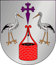 The arms are Argent a cross fleury fitchy Purpure, a well Gules masoned Argent and flanked by two storks proper respectant. Mural crown Argent with three visible towers (village rank) and white scroll reading "POCEIRÃÃO - PALMELA" in black upper case letters.