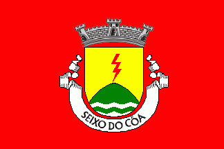 Shield Or, issuant from a base wavy of Argent a Vert a mountain Vert, in chief a paly thunderbolt Gules. Mural crown Argent with three visible towers (village rank)and white scroll with inscription in black initials "SEIXO DO CÔA".