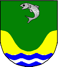 Shield Azure, issuant from base wavy of Azure and Argent a valley Or, in central chief a trout salient Argent. Mural crown Argent with three visible towers (village rank) and white scroll with inscription in black initials "VALE DE ESPINHO".