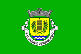 Shield Or with base wavy of Azure and Argent, a gridiron Sable between two olive branches Vert fruited Sable with their feet in saltire. Mural crown Argent with three visible towers (village rank) and white scroll with inscription in black capitals "S. LOURENÇO DE RIBAPINHÃO".
