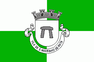 Shield Argent, a dolmen Sable (on flag realised as grey). Mural crown Argent with four visible towers (town rank) and white scroll with inscription in black capitals "S. MARTINHO DE ANTA".