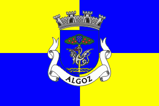 Shield Azure, an orange tree eradicated trunked Or, leaved Vert and fruited Gules, the crown superimposed by an ogival inescutcheon Azure charged with eleven plates ordered 3:2.3:2:1, enwinded by a winged serpent Argent (a kind of dragon / Portuguese: serpe alada) tongued Gules. Mural crown Argent with four visible towers (town rank) and white scroll reading in black uppercase letters "ALGOZ". An older (?) variant shows slight modifications: 1) black cogwheels in dexter and sinister chief; 2) "JUNTA DE FREGUESIA DE ALGOZ" inscription in black upper case letters. Before being upgraded the number of visible towers had been three (village rank).