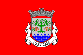 Shield Argent an oak eradicated Vert between two almond branches Vert blossomed Gules seeded Or, issuant from base an embattled castle wall Azure masoned Argent. Mural crown Argent with three visible towers (village rank) and white scroll reading in black upper case serifed letters "CARVIÇAIS".