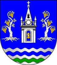 Shield Azure with base wavy of Argent Azure and Vert, a belfry's top Argent masoned Sable with bell Or, flanked by two eradicated vine plants Argent fruited Or, Mural crown Argent with four visible towers (town rank) and white scroll with inscription in black capitals "A DOS CUNHADOS".