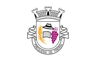 Shield Argent, a book Argent, sometimes on a plate Sable, flanked by a wheat ear Or at dexter and a grapevine Purpure at sinister, in chief a hat Argent ribboned Sable. Mural crown Argent with three visible towers and white scroll with inscription in black upper case letters "FREGUESIA DE FREIRIA".