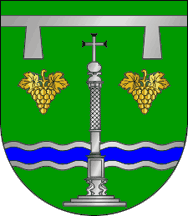 Shield Vert, over all on a barrulet wavy Azure fimbirated Argent, a calvary Argent flanked by two bunches of grapes Or leaved of the Same and a two-pointed label Argent . Mural crown Argent with three visible towers (village rank) and white scroll reading in black upper case letters RÔGE.