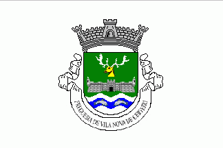 Shield Vert, base wavy of Argent and Azure, the wave Azure charged with two fish affronty Argent, in centre a rampart Argent masoned Sable, in chief a fallow deer´s head Or armed Argent. Mural crown Argent with three visible towers (village rank) and white scroll with inscription in black initials: "FREGUESIA DE VILA NOVA DE CERVEIRA".