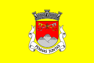 The shield of the arms is Gules a craggy mount of three coupeaux garnished Sable (acc. to Portuguese blazon: masoned), in chief a bendy key Or and a sinister bendy key Argent, both set per saltire, tied Or with their wards turned to the chief. Mural crown Argent with three visible towers (village rank) and white scroll reading in black upper case letters "PENHAS JUNTAS".