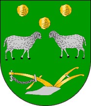The shield of the arms is Vert, two sheep passant respectant Argent,in chief three stones Or emphasized Sable set 2:1, in base a plough Or bladed Argent. Mural crown Argent with three visible towers (village rank) and white scroll reading in black upper case letters "VILAR DE LOMBA".