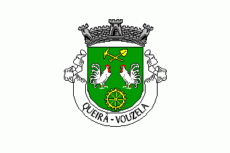 Shield Vert two roosters respectant Argent armed Gules, on chief a pick axe Or and a spade Or in saltire, on base a scoop wheel Or. Mural crown Argent with three visible towers (village rank) and white scroll reading in black upper case serifed letters "QUEIRÃ - VOUZELA".