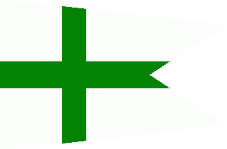 Triangular pennant, white, green off-centred cross, plain red anchors pointing to centre in both hoist quarters.
