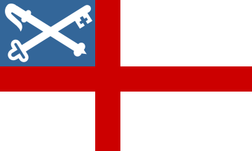 In comparing this flag to the one at the top of this page, we see that the referenced flag has a centered George cross, with narrower arms. The canton of the referenced flag has a longer (proportionate) length than does this flag. We might assume that similar flags of churches in the UK will reflect the centered George cross; those of the US, the off-centered George cross. The main similarity, of course, will be the presence of the crosier-and-key arms somewhere in or near the canton (see http://www.anglicancatholic.org.uk/gallery/st_alban_mission.html [retrieved]).