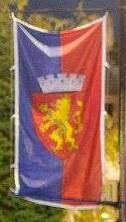 The flag appears to be used mostly in a vertical format, divided blue and red with the arms centred. An example of a flag made horizontally seems to confirm the vertical format - the shield is rotated sideways.