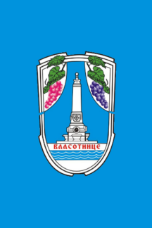 The flag of Vlasotince is blue with the municipal emblem in the middle. Two versions of the flag are in use, differring only by the colour of the bunch of grpaes displayed in the let corner of the arms, either red (photo, photo) or yellow/green (photo).