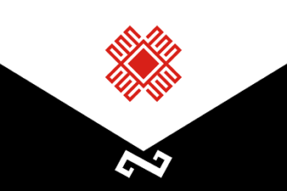 It is a white flag quartered asymmetrically by a line of division near the bottom of a complex design, and a