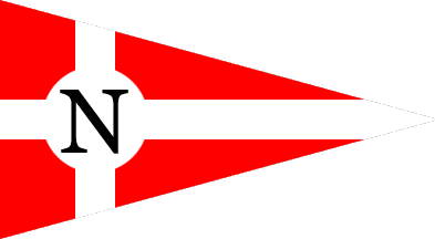 Shown as a drawing, the house flag is a very Danish-looking pennant: red with a white cross throughout - which necessarily resembles the Scandinavian or Nordic variety - and a white disk in the cross’s centre bearing a black initial "N" (serifed).