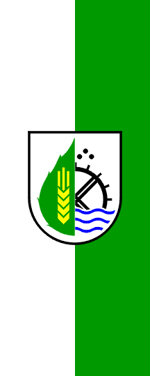 The flag is rectangular, in proportions 2:5, horizontally divided white-green, with the municipal coat of arms in the middle. The size of the coat of arms is 61% x 76% of the flag height.
