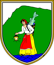 The coat of arms of Luče pictures on a silver background a green mountain and on a blue stonly base standing a peasant women holding a lamp in dexter and in a back-basket a fish proper.