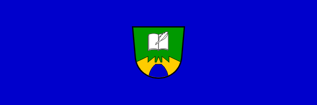 The flag is rectangular, in proportions 1:3, blue with the coat of arms set in the middle. However, a scan of a table flag sent by the municipal administration to Pascal Gross shows a flag in proportions 1:2.