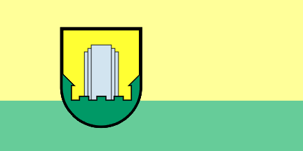 The flag is pale yellow with a pale green stripe in base and with the municipal coat of arms offset to the hoist.
