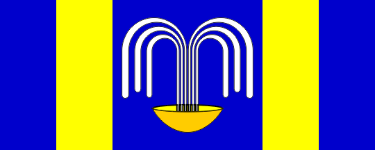 The flag is rectangular, in proportions 2:5, blue with two vertical yellow stripes forming a square field in the middle of the flag containing the attribute of the coat of arms, the bowl sprinkling water.