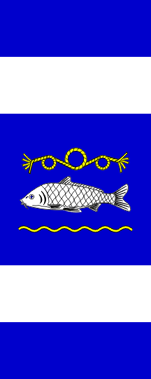 The flag is horizontal, in proportions 2:5, blue with two vertical white stripes forming a central square field containing the carp, cord and one wavy line from the coat of arms.