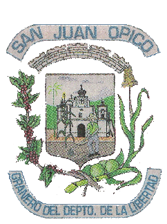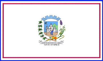 San Juan Opico is at La Libertad Department. Flag is white rectangle with thin red and blue stripe in its perimeter and charged with the Coat of Arms. Photo at <sanjuanopico.isdem.gob.sv>.