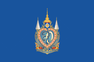 The blue flag is the Thai queen's personal standard. H.M. Queen Sirikit was born on 12 August 1932 and married H.M. King Bhumibol Adulyadej on 28 April 1950. Her emblem is made up of two Thai initials – standing for her name – beneath her crown. Her flag bears the emblem in the center of a light blue field.
