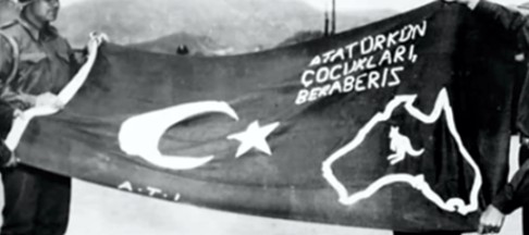 The original caption implied that this special-made flag was presented by the Australian military to a Turkish military unit somewhere in Korea. The Turkish writing means in English: ''Sons of Atatürk, We Are Together''; c. Korean War, early 1950s. The letters "A.T.I." or "A.T.L." appear below the crescent moon; it would be interesting to know what they mean: the "A" could represent "Australia" and the "T" for "Turkey", or maybe meaning something totally different. Regarding the slogan on this flag, today (2024) Turkish secularists like Ataturk's reforms, but opposing Turkish Islamists probably find the expression "Sons of Ataturk" as being pejorative. As noted in Wikipedia: "Mustafa Kemal Atatürk, also known as Mustafa Kemal Pasha until 1921, and Ghazi Mustafa Kemal from 1921 until the Surname Law of 1934, was a Turkish field marshal, revolutionary statesman, author, and the founding father of the Republic of Turkey, serving as its first president from 1923 until his death in 1938." https://en.wikipedia.org/wiki/Mustafa_Kemal_Atat%C3%BCrk