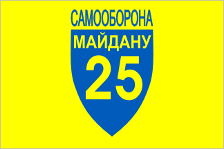 In november 2013 Maidan self-defense units were organized. 5 January 2014 several flags for companies of Maidan self-defense ("sotnia") were sanctified and presented to the units. At the photos I saw flags of 2nd. 5th, 6th, 9th, 16th, 19th, 25th companies with respective ciphers. All flags have standard design – yellow field with blue shield contains number of the company. Inscription – "SAMOOBORONA MAIDANU" ("Maidan self-defense").