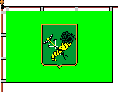 "In September 14 1995 the session of the town council approved the gonfalon: a rectangular canvas with a ratio of the sides 3:2, there is a city emblem in a vert field." For the image from that site click here.