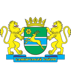 "It was confirmed at September, 27th, 2002. In the vert field is azure beam with argent fringings, in the centre is a or deer in a jump, above it is or flower in the right corner. The board is crowned by or territorial crown with battlements from lime and leaves and supported from both parties by two or lions with gules tongues. Below it goes an azure tape with or inscription "Sambirs'kyi region". The author is A.Grechylo. The deer representatives local fauna, it also appears on the arms of city of Sambir. The flower specifies, that the southern part of area enters into region Bojkovshchyna. In the big arms or lions certify a belonging of area to L'viv oblast'. The strip symbolizes Dnister river which proceeds on territory of area and divides it into two parts. Vert color means rich natural resources.