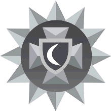 Horizontally light blue-dark blue-light blue, with narrow light-blue and dark-blue stripes below the central strip, overlain by a 12-pointed golden star bearing a red disk on which is a silver cross pattee bearing a gold-edged blue shield with a white crescent moon.