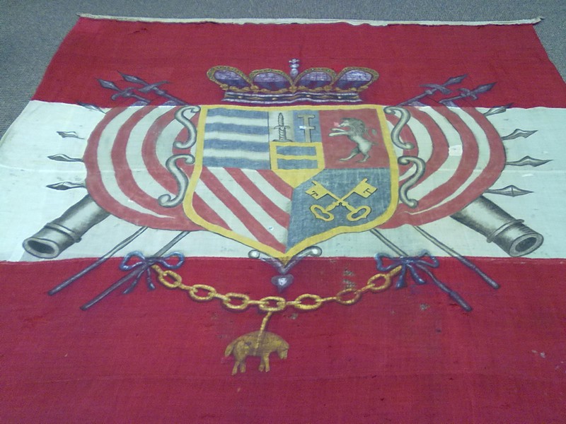 Hi, I work for a costume frame shop in Scottsdale AZ. This antique flag is currently in our shop. I'm wondering if you can help me date it. It's quite large and marked "Tuscan Ensign" on the top border.