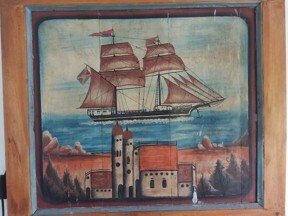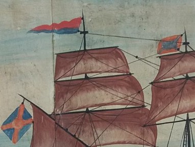 I wondered if you might recognise this type of ship and the blue and red flag? Painting seen in Denpasar, Bali. At a guess, this is mid/late c19th and associated with the NEI.