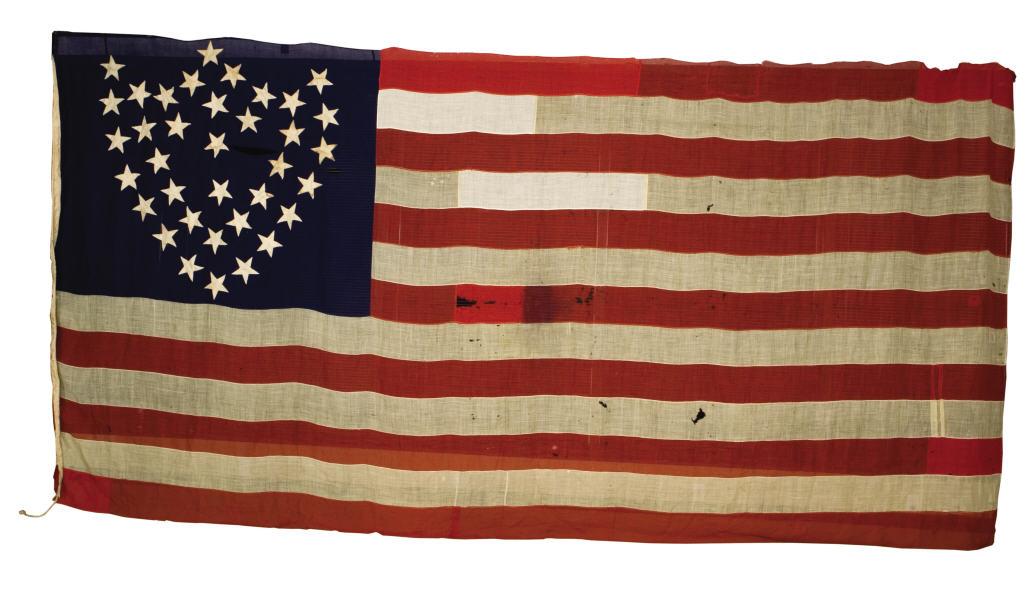 The "Windblown Flag" of thirty-six stars was once the possession of Civil War veteran, Louis Bernard, later a pioneer in Oregon. The canton's illusionistic design that appears to taper at one end, creates the impression that the flag is in motion - or "windblown" - even when at rest, as shown here.