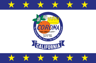 Future[.]" in white lettering. The background color of the central image is white, and contains an orange attached to a green stem and leaves in the upper part. This orange covers the lower right-hand corner of a golden coronet, which in turn extends to the edge of the outer circle. The word 'CORONA' in large blue italic block letters is written in the middle of the central image, across both the face of the orange and the background, The city motto written in smaller blue block lettering and set off by quotation marks is written beneath 'CORONA', while at the very bottom of the central image are the words in lower-case script 'Incorporated July 13, 1896.'