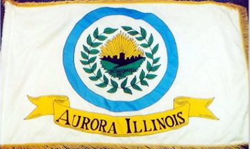 adopted June 18, 1967, and sent for production, but was not to be revealed publicly until the following month. Because of delays in the manufacturing process, the unveiling was delayed until December 18, 1967. The winning designer was Bonnie Nigales, a 14-year-old freshman at Madonna High School. She received the first flag and an engraved plaque from Mayor Albert McCoy. Second place winner, Max Gimple, also received a flag. The winning design depicts the silhouette of the city skyline in black against the blaze of a yellow aurora. Beneath the skyline is a green valley on which is the inscription "Incorporated 1857" in black. This is encircled by two sprigs of leaves joined at the bottom. Around the sprigs is a blue ring and beneath is a yellow ribbon bearing the inscription "Aurora Illinois" in black. The whole field of the flag is white. Ms. Nigales described her design saying the blue represented the peacefulness of the Fox River Valley. The green was for the fertile lands around the city and the yellow was for the Aurora Borealis, after which the city is named.
