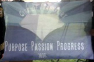 The flag appears to be dark blue with a logo in white, the name above and a slogan below.
