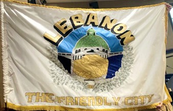 yellow arms shaking hands. The top of the flag reads "LEBANON" in an arc and the
