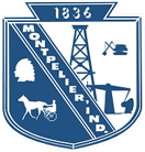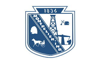 The Coat of Arms of Montpelier consists of a two colors, White and Blue. The arms is diagonally bisected by a blue line with the city's name on it, along with the state abbreviation 'IND'. On the blue half are the white outlines of an Indian head and a horse-drawn carriage, representing the precolonial and early history of Montpelier. on the white half is a blue oil derrick, early excavator, and an oil pump. This represents the industrial era of Montpelier and its gas boom.