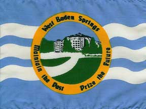 West Baden Springs is a town in Orange County, Indiana, United States. The population was 618 at the 2000 census. It seems is a popular spa resort. The flag is blue with three wavy white horizontal stripes and overall an orange ring with the town name and motto and in the center an illustration of a high-rise complex set among trees and parkways.