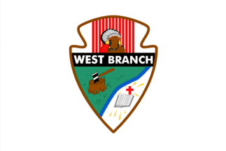 The emblem can be seen in black and white at the bottom of the city website, www.westbranch.com. It is an unusually shaped shield, with a person's head in chief separated from the rest by a bar bearing the name "WEST BRANCH", and the rest divided vaguely per bend, with the charges seeming to be a tree stump (brown on green) and a shining bible and cross (cross red, rays yellow, field white).